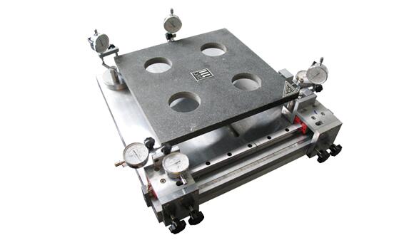 本儀器由支承平板、可移動(dòng)的左支座和右支座組成一個(gè)直角坐標(biāo)系。在平板上有三個(gè)等高支承銷與陶瓷面磚類似外形和具有理想尺寸的標(biāo)準(zhǔn)板進(jìn)行探測,并將儀表值調(diào)整至適當(dāng)位置,并記下該示值。然后,以被測陶瓷面磚取代標(biāo)準(zhǔn)板,在不移動(dòng)測量點(diǎn)的情況下,分別測出六項(xiàng)指標(biāo)參數(shù)。左、右支座及中心測量支座可在平板上作平行移動(dòng),組成不同位置的空間座標(biāo),以適應(yīng)不同規(guī)格尺寸陶瓷面磚的測定。